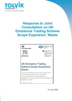This response provides Tolvik’s evidence to the ETS Authority with respect to its consultation on “UK Emissions Trading Scheme Scope Expansion: Waste”Tolvik is providing this response independently with the objective to help ensure decisions made by the ETS Authority in respect to the inclusion of waste incineration and Energy from Waste plants is supported by the best available market information.
